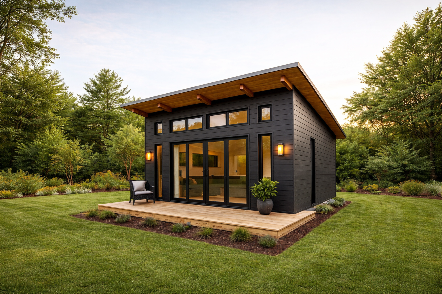 Our Texas Modern Studios are designed to make a statement. Featuring bold exterior finishes, clean architectural lines, and warm natural accents, this style delivers a high-end look in a compact footprint. Large windows and expansive glass doors bring in natural light and create a seamless connection between indoor and outdoor living.